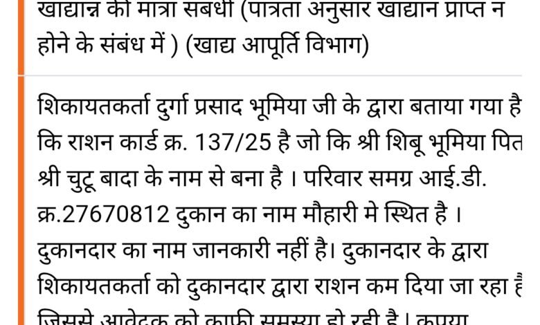 आदिवासी बाहुल्य इलाका होने के कारण यहां पढ़े-लिखे लोग कम हैं, जिससे इसका फायदा उठाकर गरीबों के हक में डाका मारा जा रहा है। हितग्राही दुर्गा प्रसाद भूमिया ने सीएम हेल्पलाइन में शिकायत दर्ज कराई है, जिसमें उन्होंने बताया है कि राशन कार्ड क्रमांक 137/25 श्री शिबू भूमिया पुत्र श्री चुटू बड़ा के नाम पर है और परिवार समग्र आईडी नं. दुकान मौहारी में स्थित है। दुकानदार का नाम ज्ञात नहीं है और दुकानदार उन्हें 9 किलो तक अनाज कम तौल के दिया है।