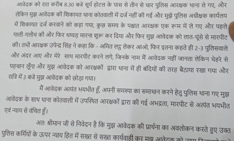 शिकायती पत्र के अनुसार, घटना 10 अप्रैल 2026 की रात की है। पीड़ित शिवम सोनी अपनी किसी पारिवारिक समस्या की शिकायत दर्ज कराने कोतवाली थाना जा रहे थे। रास्ते में सूर्या होटल के पास 3-4 पुलिस आरक्षकों ने उन्हें रोक लिया और थाने ले गए।