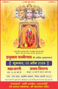 कटनी के पठरा धाम में हनुमान जन्मोत्सव के अवसर पर भव्य समारोह का आयोजन किया जा रहा है। इस अवसर पर गुरुवार, 02 अप्रैल 2026 को महाआरती और प्रसाद वितरण का आयोजन किया गया है।
